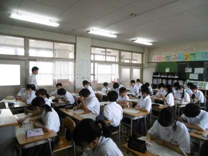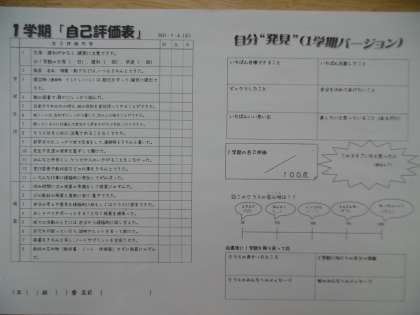 全学級で「自己評価表」と「サンクスカード」を使って、1学期の振り返りを行っていました。1学期の自分の学校生活を振り返り、夏休みの目標を立てることで、2学期の行動へとつながっていきます。写真は1年2組です。