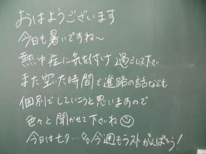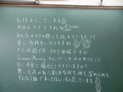 写真は上から、3年4組と2年1組の黒板メッセージです。今日は七夕です。願い事をしてみてはいかがですか。