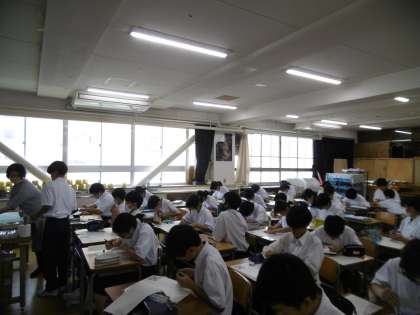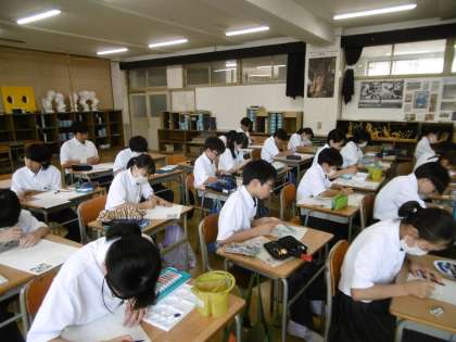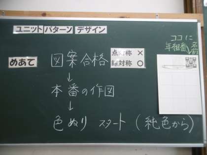 学習教材は「ユニットパターンデザイン」でした。今日もたくさんの生徒が自分の作品について、アドバイスをもらうために教科担当の先生のところへ行っていました。77期生は、作業を黙々と集中してできる学年です。