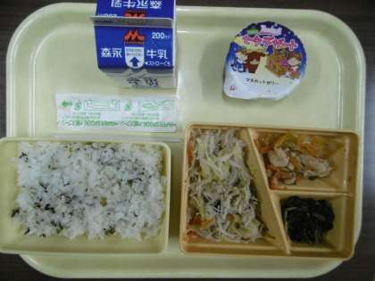 今日のメニューは、菜めし、炒めビーフン、ささみとピーマン炒め、ほうれん草のしらす和え、七夕ゼリー、牛乳です。