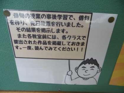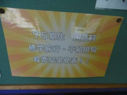 国語の授業で取り組んだ「修学旅行・平和俳句」が2階廊下に掲示されています。今週から始まる期末懇談でご来校の際に是非、ご覧ください。