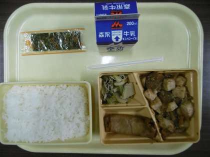 今日のメニューは、白ごはん、マーボードーフ、春巻、チンゲン菜とえのきの和え物、のり、牛乳です。