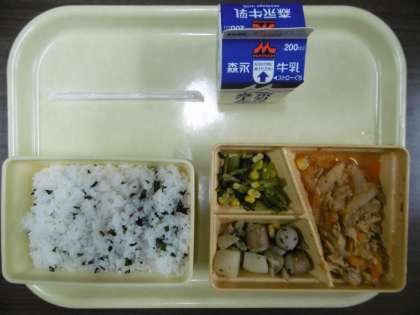 今日のメニューは、わかめごはん、豚肉のバーベキューソース、ソーセージときのこのアヒージョ風、小松菜とコーンの炒め物、牛乳です。