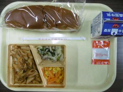 今日のメニューは、ハニーパン、ミートペンネ、チンゲン菜の炒め物、にんじんサラダ、ミルメーク、牛乳です。
