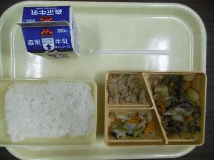 今日のメニューは、白ごはん、肉じゃが、かつお和え、シーチキンのそぼろ煮、牛乳です。