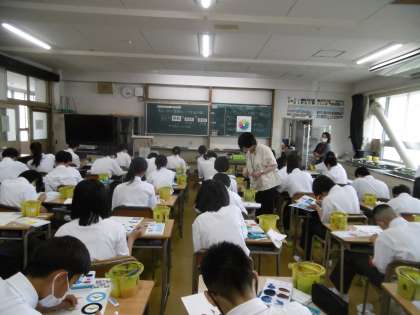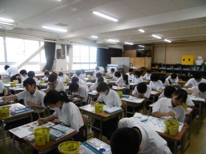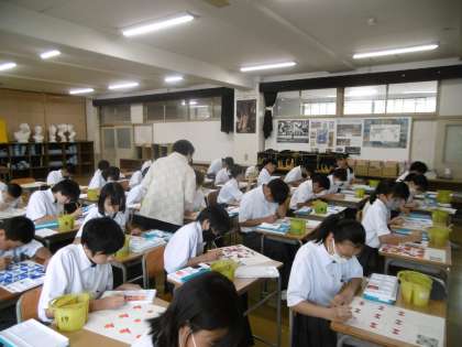 学習内容は「ユニットパターンデザイン」、学習のめあては「単位を並べて、模様化して、デザイン画を描く」でした。美術の授業は全学年を通して、いつも本当に静かです。全員が黙々と自分の課題に取り組んでいます。