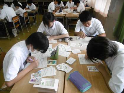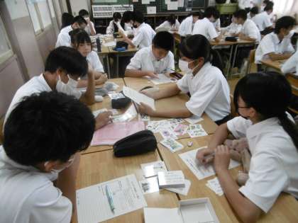 2年生で取り扱う人権学習(ジェンダー学習)のまとめを行っていました。授業のねらいは「LGBTをはじめとするいろんな立場の人たちの気持ちを考え、自分のできることを考えよう」でした。イコーラムかるたを使って、自分の考えを班で交流し、授業の最後でクラス全体でまとめていました。