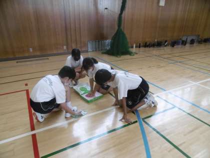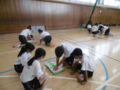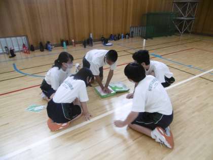 救急救命の練習をする前に実施方法や注意点などを表した動画を全員で見ています。いつ起こるか分からない緊急事態に備え、どの生徒も真剣に講習に臨むことができていました。応用編として、グループ内で役割分担(救急車を呼ぶ人、心肺蘇生をする人、応援を頼む人、AEDを持ってくる人)を行い、実際の緊急事態を想定しながら、救急救命を行っているグループもありました。