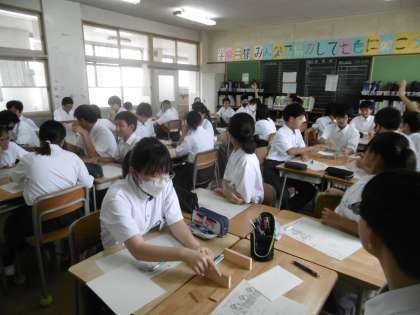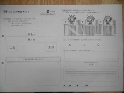 学習内容は「じょうぶな構造を考えよう」でした。木片、紙1枚、おもりを使って、個人思考をしたのち、班で話し合いながら、じょうぶな構造を考えています。紙1枚を使って、おもりを乗せても落ちないようにするにはどのようにしたらよいかを一生懸命に考えていました。ルールは、紙を折り曲げてもよいが、ハサミを使ったり、ちぎったりしてはいけないでした。悪戦苦闘しながらも、楽しそうに頭を高速回転させていました。