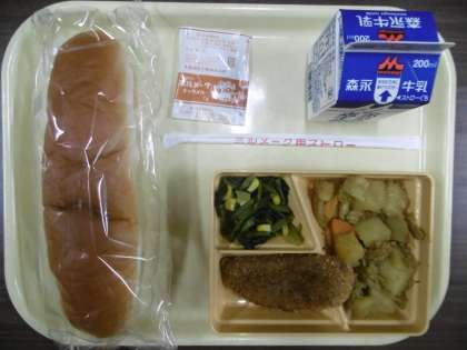 今日のメニューは、ハニーパン、じゃがいものインド風煮、米粉ハムカツ、小松菜とコーンの炒め物、ミルメーク、牛乳です。
