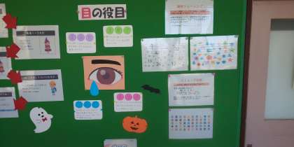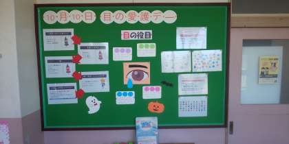 本校の養護教諭が10月10日の「目の愛護デー」にちなんで、素敵な掲示物を作成していました。目の愛護デーは、目の健康や大切さに関する活動、報告が行われる日で、1947年に中央盲人福祉協会が10月10日を目の愛護デーと定めました。