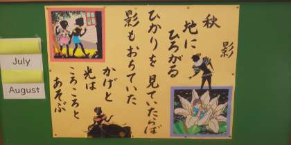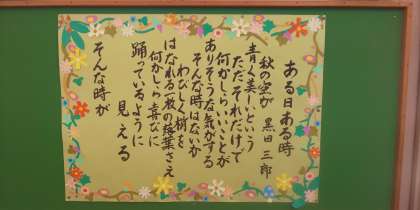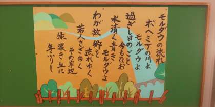 各階に掲示されている秋を感じさせる掲示物です。本校の支援員さんが毎月、作成してくださっています。本校の伝統行事で歌われる「モルダウの流れ」も作成していただきました。合唱コンクールは10月25日(水)に行われます。
