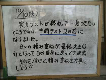 本校の3年学年主任からのメッセージです。中間テスト2日前となりました。テスト前の家庭学習をがんばりましょう。