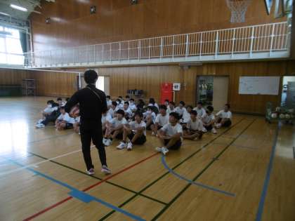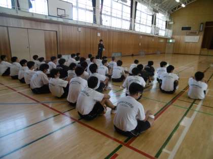 学習内容は「バレーボール」でした。75期生の先生の話を聞く態度は立派です。感心しました。教科担当の先生の見本(サーブ)もしっかり見ることができていました。