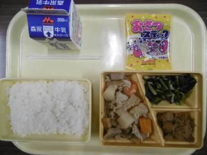 白ごはん、みそおでん、小松菜としめじの炒め物、かつおそぼろ、おさつスティック、牛乳です。