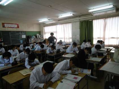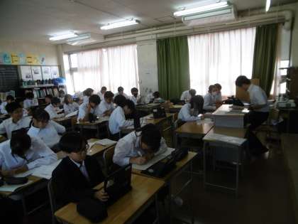 中間テスト前日のため、テスト勉強をしていました。1年生も2年生と同様に学年全員の先生で生徒のサポートにあたっていました。写真は上から、1年1組、1年2組です。