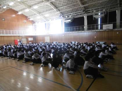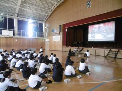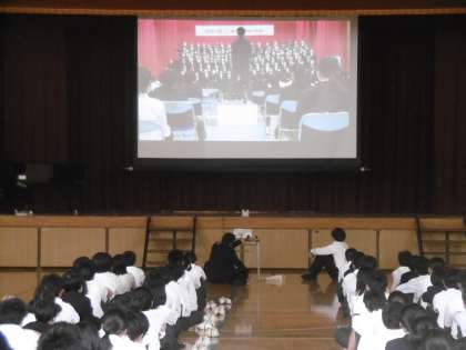 3年生と同様に、月曜日から本格的に始まる合唱練習に向けて、イメージをもち、目標を立てて明確に練習に取り組むために、昨年度の合唱コンクールの映像を77期生全員で見ていました。迫力がある中学校で行う合唱コンクールのイメージをもつことができたでしょうか。1年生の「精一杯」を期待しています。