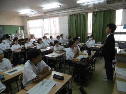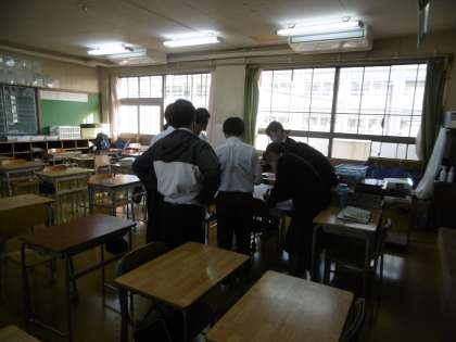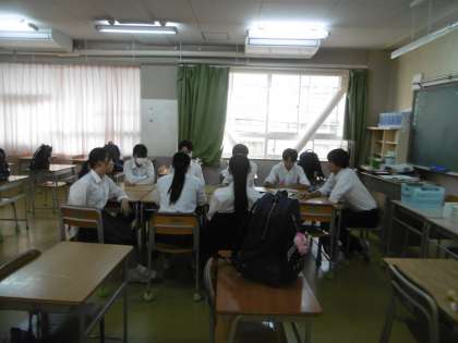住道中学校では月に一度、部活動をなしとし、集団づくり(仲間づくり)の観点から班長会を行っています。各学級担任と各クラスの委員長と班長が班長会に参加します。話し合う内容は毎月様々ですが、自分のクラスの課題を子どもたち自身で解決できるような自治的活動が行えるようになることが班長会の目的です。写真は上から、3年2組、2年4組、1年生の拡大班長会の様子です。