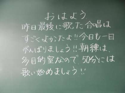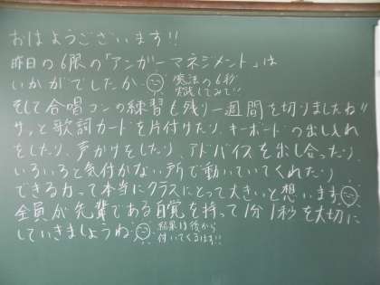 写真は上から、1年1組、2年1組です。合唱コンクールに向けてのメッセージが多くなってきています。各教室とも生徒が登校する前に、教室の環境整備(換気や机の整頓、教室内の美化など)はすでに整っています。