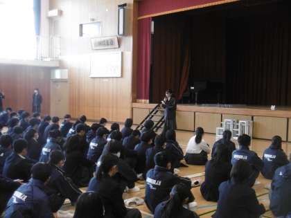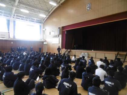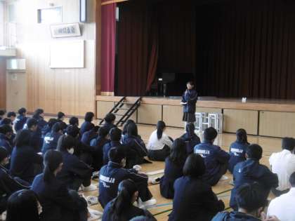 図書委員会、校風委員会、体育委員会、図書委員会から報告がありました。明日も各委員会から報告があるので集会が行われます。今日も時間通りに集会が生徒会役員の進行のもと始まっていました。
