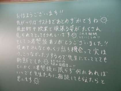 写真は2年1組です。担任の先生は欠かさず毎日、生徒に向けて黒板にメッセージを書いています。
