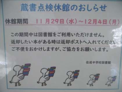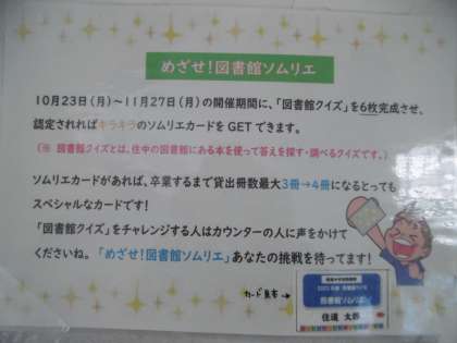 「蔵書点検に伴う図書館休館」と「図書館ソムリエ」についてのお知らせが掲示されていました。