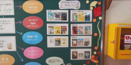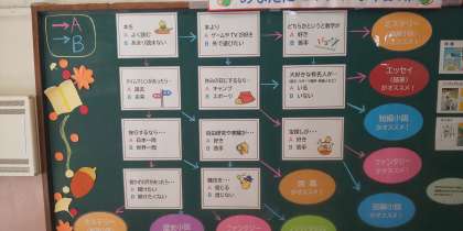 玄関黒板が新しくなりました。本校の学校司書が「あなたにピッタリな本診断」と題して素敵な掲示物を作成してくれました。図書館内にも素敵な掲示物がたくさん作られています。12月に行われる期末懇談で本校の図書館を見に来ませんか? 住道中学校では「親読(親子で一緒に読書)」をめざしています。