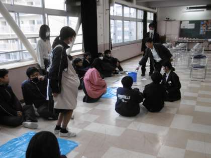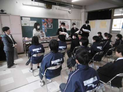 今日は大東市内で養護教諭として以前働いておられた先生を講師として本校にお招きし、いのちの授業の3時間目を全学級で行いました。「生命の大切さを知り、かけがえのない自分について考える」、「成長期にある自分や異性の心と体について理解する」を指導目標とし、授業の前半は、「抱っこ体験」をしました。写真は赤ちゃんがお腹にいる時の重さを代表生徒が実際に体験し、買い物やトイレ掃除を行った時の大変さをみんなで見ているところです。体験前には1年生の先生が、赤ちゃんの抱っこの仕方やミルクの飲ませ方について、生徒に話をしていました。写真は3時間目に行われた1年4組の授業の様子です。