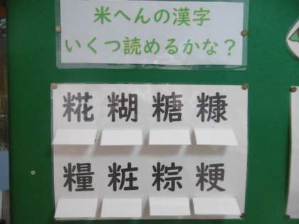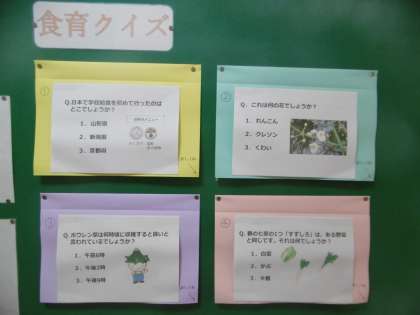 本市の栄養教諭が作成した「食育クイズ」の掲示物が職員室前廊下に飾られています。「米へん」のつく漢字クイズや食育に関するクイズが出題されています。