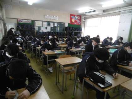 写真は授業開始後の漢字テストをしているところです。物音ひとつしない本当に静かな教室でした。生徒は集中してテストを受けていました。