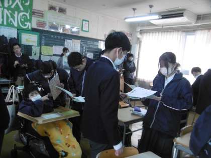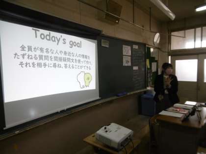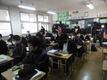 今日は大東市教育委員会より指導主事が来られ、授業改善に向けて、様々な指導及び助言をいただきました。英語科の先生を含め、たくさんの先生方が授業見学に来ていました。授業のめあては「全員が有名な人や身近な人の情報を尋ねる質問を間接疑問文を使って作り、それを相手に尋ね、答えることができる」でした。個人思考の時間は生徒の頭は常に高速回転をしている授業でした。