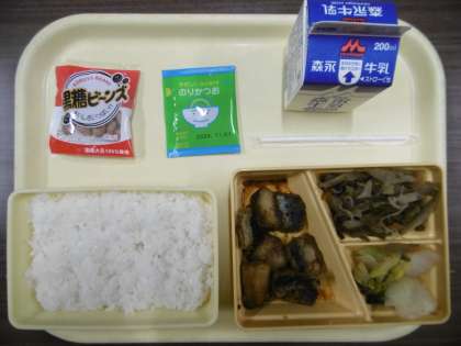 今日のメニューは、白ごはん、いわしのしょうがだれ、茎わかめ入りきんぴら、おひたし、ふりかけ、黒糖ビーンズ、牛乳です。