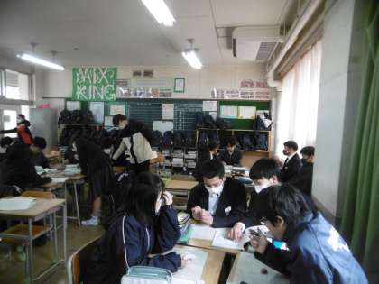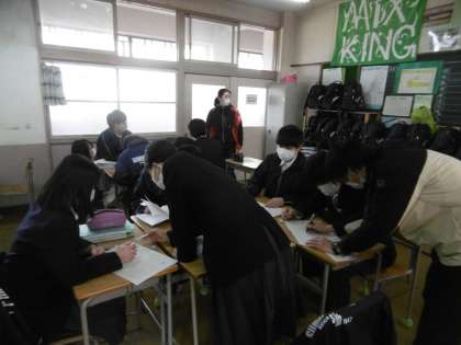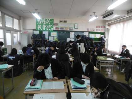 英語、数学に続き、理科も入試対策プリントを4人班を活用しながら、みんなで解いていました。教室からも目前に迫った私立高校等入試の緊張感が伝わってきていました。