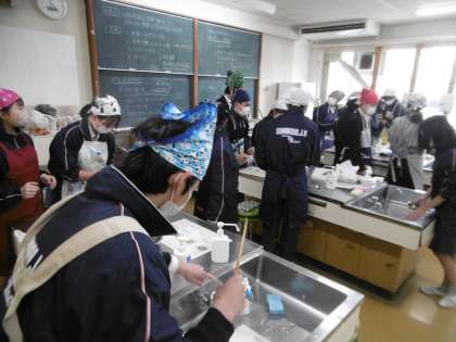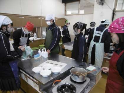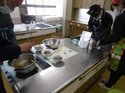 学習内容は「調理実習」でした。授業のめあての「おいしい牛丼の具を作ろう」の達成に向かって、班で一致団結して調理に取りかかっていました。いい匂いが調理室中に漂っていました。調理実習の実施にあたっては、複数教員によるアレルギー対応の確認に加え、教室の換気や手指消毒、マスクの着用を徹底して行っています。