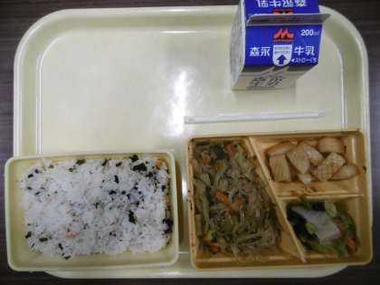 今日のメニューは、鮭わかめごはん、春雨のひき肉炒め、いかのてり煮、かつお和え、牛乳です。