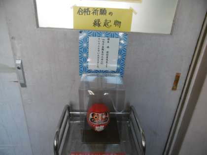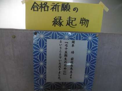3年学年職員室前廊下に飾られていました。受験を目前に控えた75期生へエールを込めて、必勝だるまをいただきました。ありがとうございました!