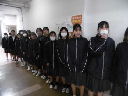 昼休みに職員室前に集合していた女子バスケットボール部員です。あまりにもきれいに、そして静かに並んでいたので写真を思わず撮りました。学校を代表するクラブに日々成長しています。
