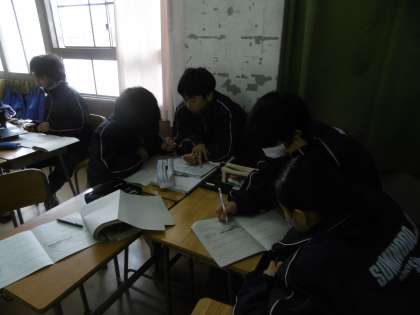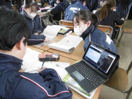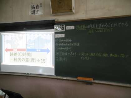 授業のめあては「クラス全員が時差を求めることができる」でした。タブレットパソコンに映し出された世界地図をもとに、4人班で一生懸命に協力しながら生徒は考えていました。クラス全員が求めることができたでしょうか。とてもよい授業のめあてだと感じました。