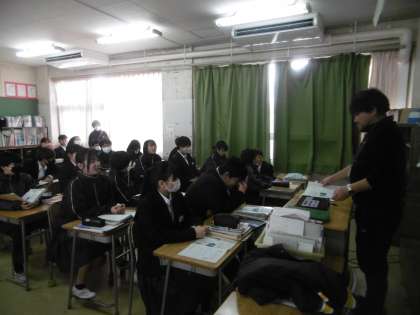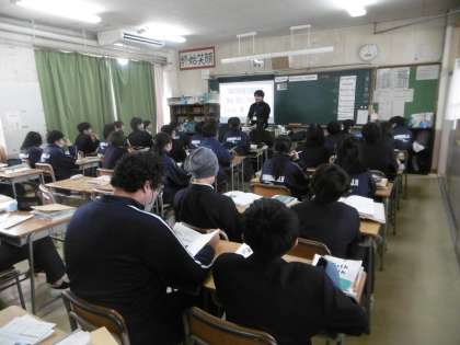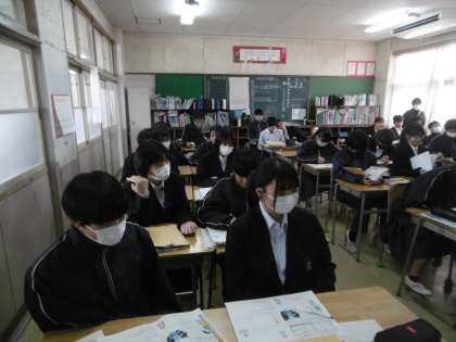 「名探偵コナン」を教材にしたとても魅力的な授業が行われていました。教科担当の先生の話がおもしろく、生徒は終始笑っていました。声も相変わらずよく出ていて、テンポもある授業展開でした。