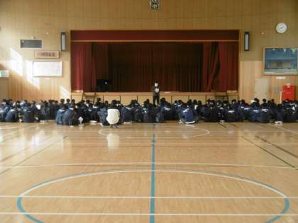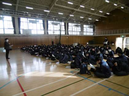 5限後、体育館で3年生は明日の私立高校等入試に向けて、前日指導が行われていました。本日発行の進路通信(第18号)をもとに、進路指導主事より明日の受験に向けて、注意事項が伝えられていました。細かな連絡事項はホームページのリンクにある進路通信をご覧ください。