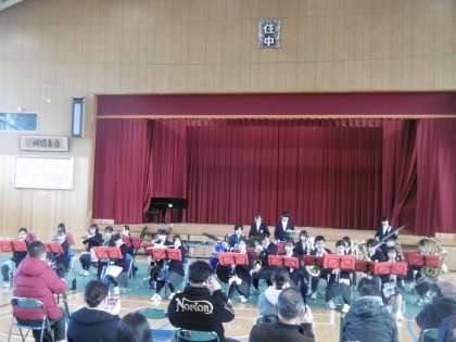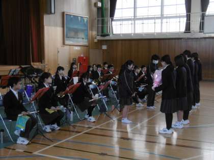 3曲の演奏は本当に見事でした。途中、引退した3年生と一緒に演奏する場面もあり、サプライズで花束贈呈も行われました。部の雰囲気もよく、部員の仲がいいことも演奏を通じて、十分に伝わってきました。