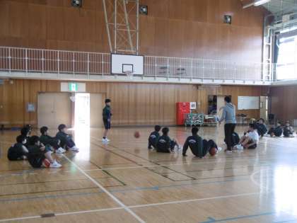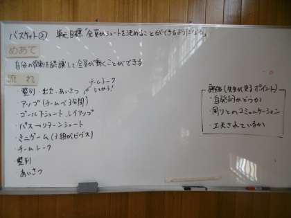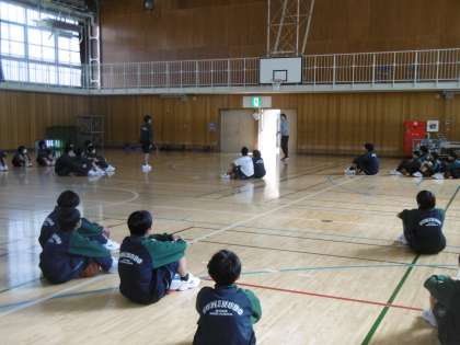 学習内容は「バスケットボール」でした。体育館内にあるホワイトボードには、授業のめあてや流れ、評価のポイントについてもしっかり記載されていました。77期生の先生の話を聞く姿勢は、今日も立派でした。