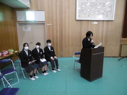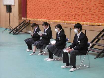昭和41年から続く、本校の伝統行事である2年生の集い(立春式)が、本日の午後に体育館で行われました。「自覚・立志・健康」のテーマのもと、「中学2年生としての社会の一員である自覚を養い、今後の自分のあり方を考え、自己の向上をめざす」を目的に第一部と第二部に分かれて行われました。