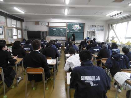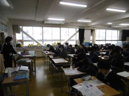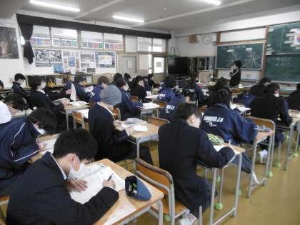 来週行われる学年末テストに向けて、プリントが配布され、その解説を先生が行っていました。今日も77期生の先生の話を聞く姿勢は見事でした。