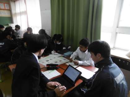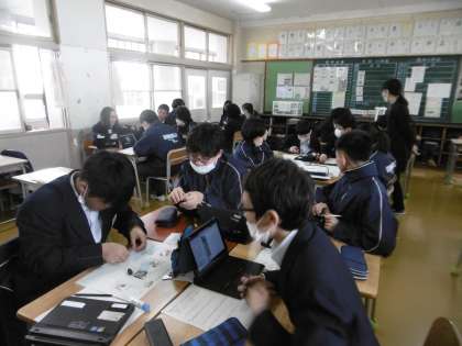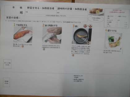 調理実習に向けて、「班全員が鮭のムニエルをおいしく安全に作れるよう計画を立てる」の目標に向かって、班での話し合いが活発に行われていました。生徒たちが調理実習をとても楽しみにしていることが授業の様子からもうかがえました。
