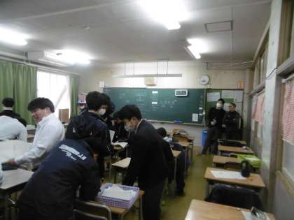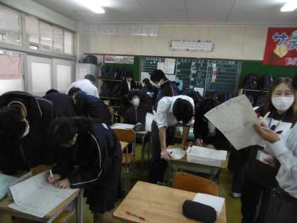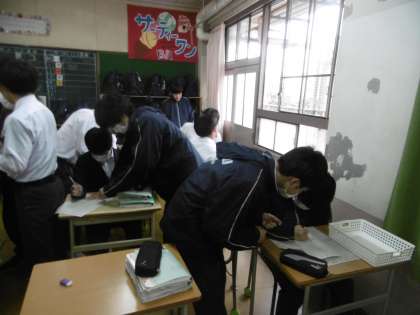 入試対策プリントをクラス全員で解いていました。分からない問題を自分で見つけた仲間に教えてもらい、プリントにサインをもらう活動をしていました。生徒の学ぶ意欲の高さと行動力にとても感心しました。2名の教科担当の先生は、教室から生徒の様子を静かに見守っていました。自分で考えて、子どもたちだけでよく動けていました。