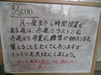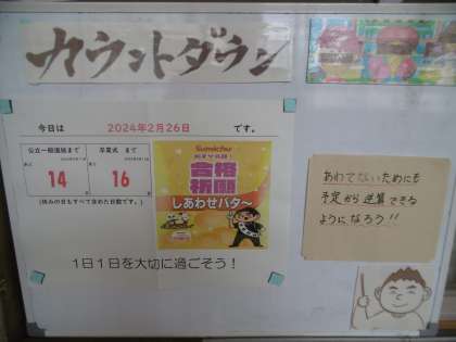 公立一般選抜入試まであと14日、卒業式まであと16日になりました。75期生の卒業も、もうすぐです。卒業式練習は今週の水曜日から始まります。