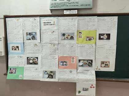 現在、玄関黒板には家庭科の作品が掲示されています。2・3年生の春休みの課題で「1食分の献立を自分で作って食べよう」という内容でした。どの作品も上手に作られていて、美味しそうでした。
