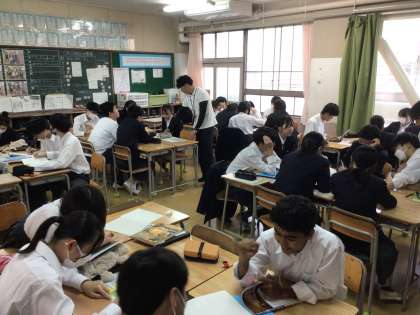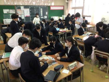3年生の6時間目は、修学旅行の班別行動のルート決めをしていました。班で話し合っています。