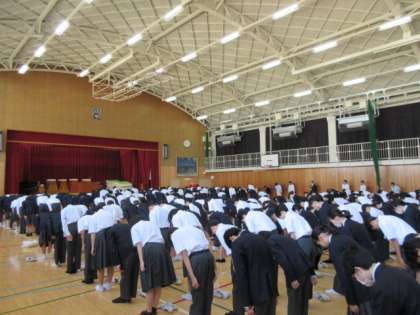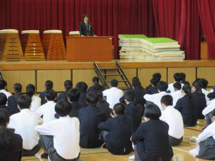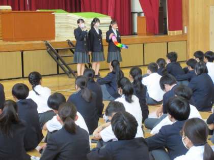 校長先生のお話のあと、明日から修学旅行に行く3年生からの発表がありました。